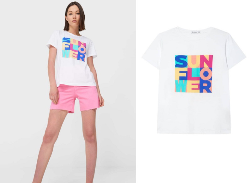 En este caso, se trata de un cuadrado formado por letras coloridas que forman la palabra Sunflower, girasol en castellano. Las letras destacan sobre el fondo blanco y pueden recordar al colorido propio de Agatha Ruiz de la Prada. Puedes comprar esta camiseta en cualquier tienda de la cadena de Inditex o en su página web por tan solo 5'99€.
