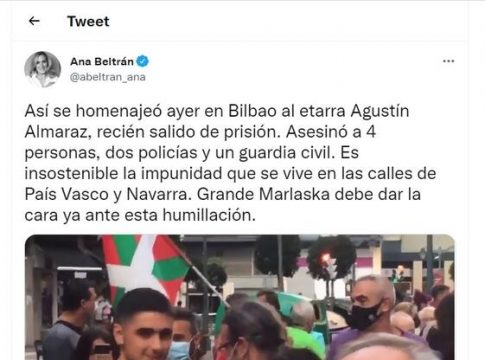 A su jucio, es "insostenible" la impunidad que se viven en las calles de País Vasco y Navarra por los homenajes a asesinos de ETA. "Grande Marlaska debe dar la cara ya ante esta humillación", ha escrito Beltrán en un mensaje publicado en su cuenta de Twitter.