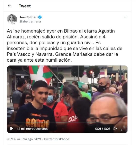 Ana Beltrán se hace eco de un vídeo del homenaje de bienvenida ('ongi etorri') brindado al miembro de ETA Agustín Almaraz Larrañaga, condenaod por cuatro asesinatos, que acaba de salir de prisión tras pasar 25 años en la cárcel.
