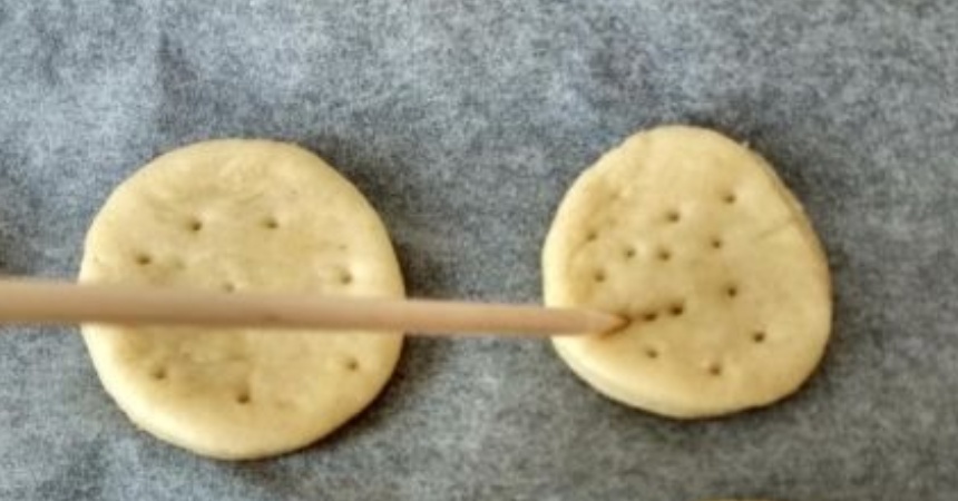 Las galletas saladas se caracterizan por no levar y por unos pequeños orificios que las hacen reconocibles a distancia. Toma un palillo y pincha la superficie de cada una, de esta manera se evita que suban o se abomben durante la cocción.