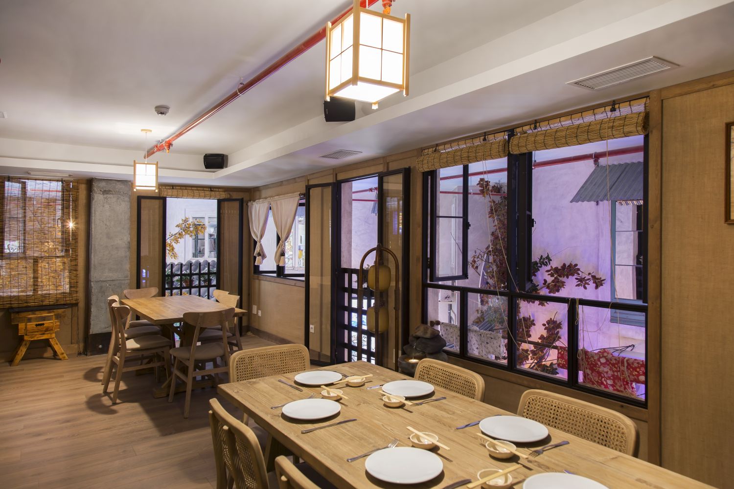 El piso superior de Running Sushi in Market regala un cambio total de ambiente hasta introducirnos en el interior de una casa tradicional japonesa, que alberga tres reservados con ventanas que dan al exterior de las calles de Tokio y donde se sirve un menú de sushi cerrado para los clientes. Un espacio perfecto para encuentros más distendidos, con la calidez que transmiten sus paredes y suelos de madera, puertas correderas tipo shoji, cortinas noren e incluso una cocina con encimera al estilo japonés más clásico en una de las salas.