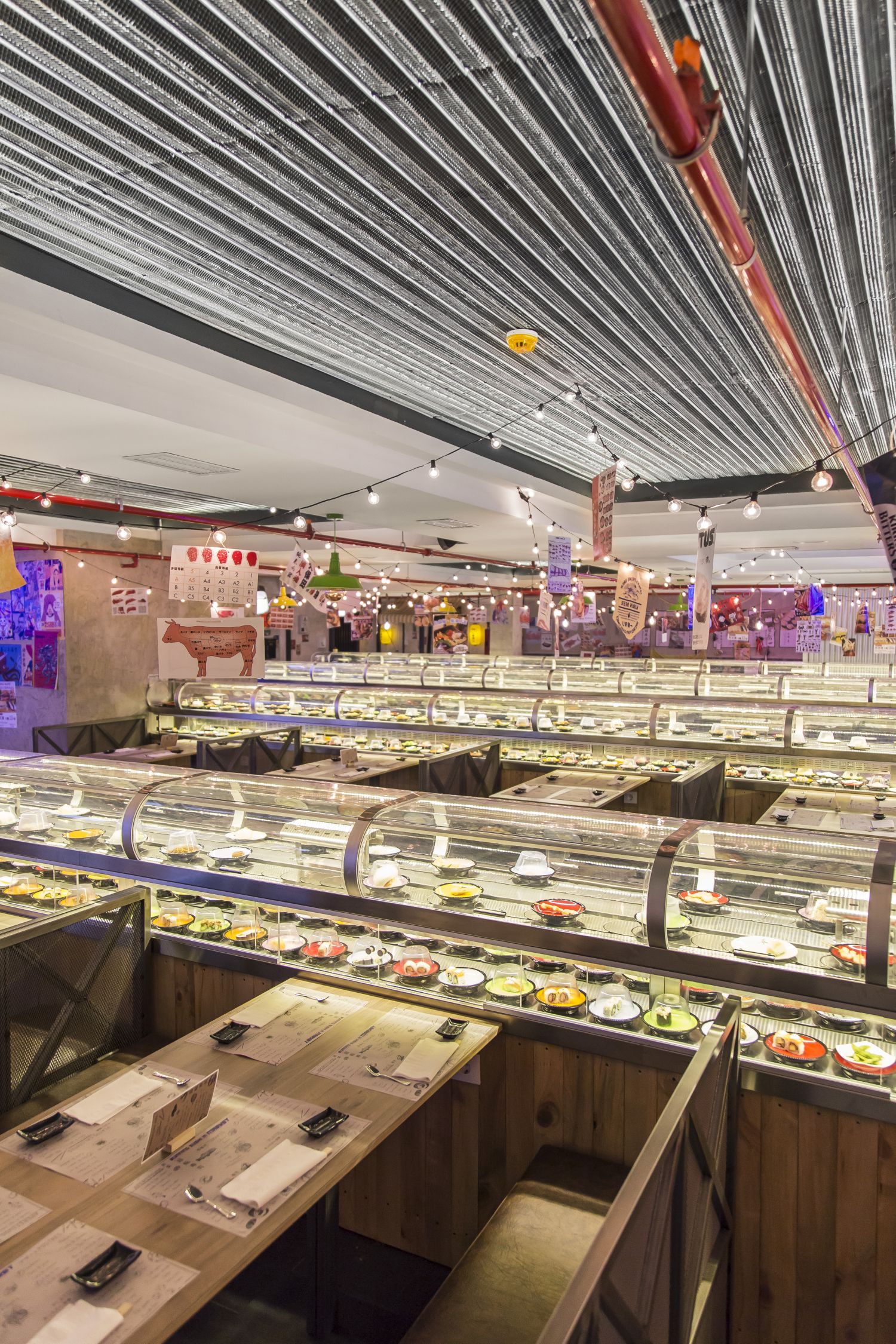 En la planta baja del local se encuentran dos zonas diferentes presididas por los tubos que recorren las 50 mesas a las que dan servicio. Desde sus cocinas ambientadas como si fueran puestos, se abastecen las dos alturas de cintas, sobre las que se colocan platillos fríos abajo (makis, uramakis, temakis, ensaladas…) y calientes arriba (tempuras, arroces, noodles, brochetas…), así, hasta llegar a las más de 70 elaboraciones fijas que se ofrecen en cada servicio y que se complementan con otras recetas adaptadas a la temporada, manteniendo la sensación de sorpresa constante que tanto gusta al público de Running Sushi.
