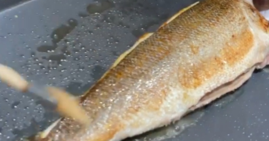 Enciende la plancha a unos 200 a 205° C y coloca la lubina sobre ella. Déjala hasta que notes que se comienza a poner dorada y que por dentro luzca jugosa. Es muy importante que medida que se vaya cocinando continúes untándola con el aceite. De esta forma garantizas que tenga el sabor a brasas que se busca obtener.