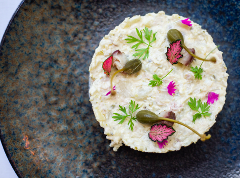 Ubicado en el corazón financiero de Madrid, Pez Fuego es la apuesta gastronómica de Grupo Oter que ha revolucionado la oferta de brasas en la capital. Cocina del mar con especial atención a la materia prima, base de una experiencia culinaria para disfrutar en un amplio espacio dividido en distintos ambientes: la barra con vistas a la parrilla, una zona lounge, la sala del restaurante, salón privado y una terraza adaptada a la temporada de invierno y verano. Su propuesta de ensaladilla rusa es muy especial ya que apuesta por la merluza en escabeche. La base de la ensaladilla lleva zanahoria, huevo cocido, patata, guisantes, bonito, mahonesa y el jugo de media lima. Para su elaboración el chef del restaurante, Francisco Martínez Sarabia, elabora el escabeche con la merluza y lo deja enfriar. Este escabeche se prepara a base de ajo, cebolla, aceite, laurel, albahaca y cavo, vino blanco, vinagre de Jerez y merluza. Posteriormente se prepara la ensaladilla y se agrega un poco de escabeche.