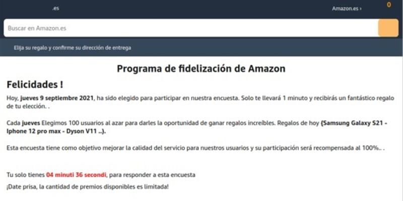 Si la víctima pulsa en alguno de los enlaces proporcionados en el correo será redirigida a una web cuyo dominio no tiene nada que ver con el de Amazon, pero que guarda un diseño similar al de esta empresa. En dicha web, se le solicitará rellenar una sencilla encuesta.