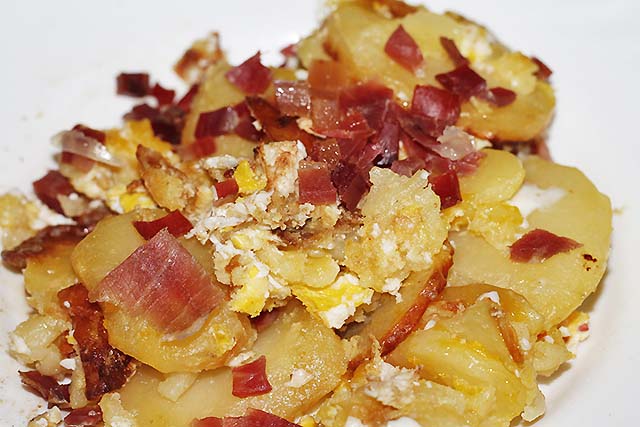Esperas unos minutos para que la masa quede más o menos uniforme, y con un hilo de aceite se fríe la mezcla en el fuego. Mezclamos suavemente como si se tratara de un revuelto, y procurando que no se queme este, retiras la elaboración de la sartén. A la hora de emplatar, se le puede echar por encima unos tacos de jamón serrano o chorizo a elección, y una hoja de perejil. Ya todo estaría preparado para disfrutar de esta maravillosa receta.