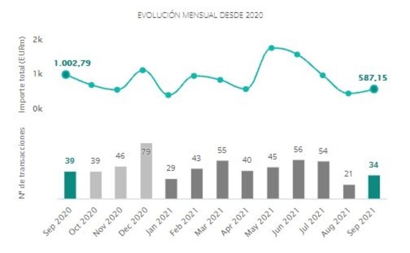 Solo en septiembre el sector inmobiliario contabilizó 34 operaciones con un importe agregado de 587,5 millones de euros. Junio fue el mes más activo en este segmento por número de transacciones, con 56, mientras que mayo fue el más activo por capital movilizado, con 1.766 millones.