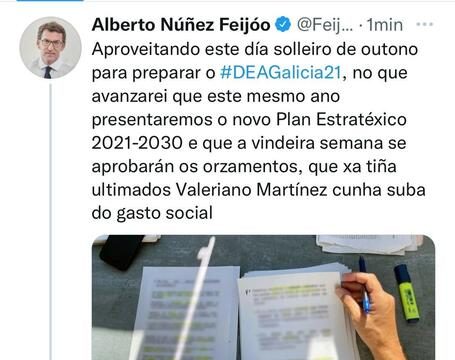 A través de su cuenta en Twitter, el titular del Ejecutivo gallego ha explicado que la próxima semana se aprobarán las cuentas para 2022 de la Xunta, que "ya tenía ultimados" el que fuera conselleiro de Facenda, Valeriano Martínez, hasta su fallecimiento la pasada semana. Además, ha indicado que anunciará que este año se presentará el nuevo Plan Estratégico 2021-2030 y abordará "mejoras" en la sanidad, las residencias de mayores y la educación.