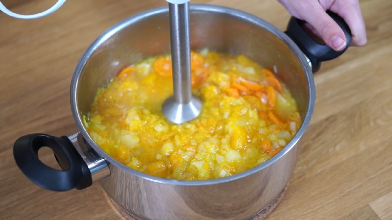 Una vez que hayan transcurrido los 20 minutos, notarás como gran parte del agua se ha evaporado y las verduras ya están completamente cocidas. Apaga el fuego y en la misma cazuela, tríturalo todo con la ayuda de una batidora de mano. Bátelo todo hasta que coja la textura que más te guste. Para que sea un puré de calabaza tiene que quedar algo espero, pero si prefieres que quede como una crema, añádele un poco de agua y te quedará más liquida...