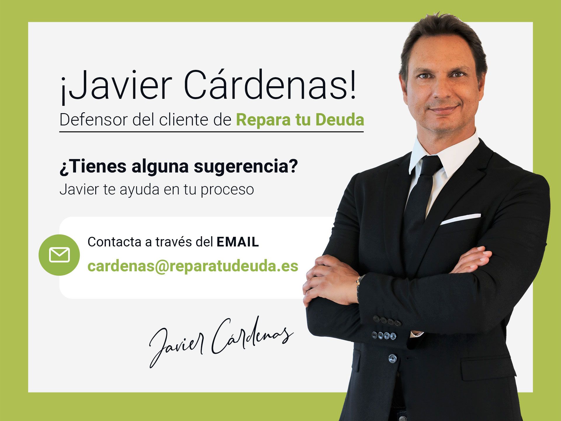 El despacho de abogados Repara tu Deuda Abogados, el primer despacho en España en aplicar la Ley de Segunda Oportunidad, ha fichado al periodista y locutor de radio Javier Cárdenas como defensor del cliente de Repara tu Deuda. De esta manera, el papel que jugará dentro de la entidad será el de mediar en caso de que haya alguna desavenencia o desacuerdo entre los clientes y la empresa, tratando de proponer soluciones para zanjar los problemas que estén distanciando a ambas partes y, así, conseguir aplicar la Ley de Segunda Oportunidad entre aquellos que lo soliciten.