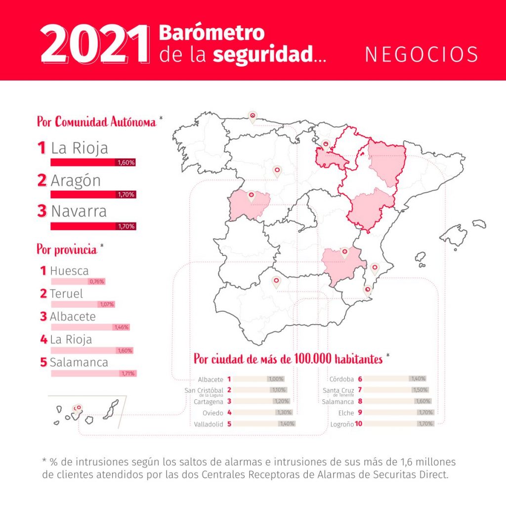Huesca, Teruel y Albacete se posicionan como las provincias con menor tasa de intrusión a negocios, ya que menos de un 1,46% de los usuarios de estas zonas han visto cómo saltaba la alarma de sus locales al detectar la presencia de intrusos. Les siguen de cerca La Rioja y Salamanca, con un ratio inferior al 1,71%.
