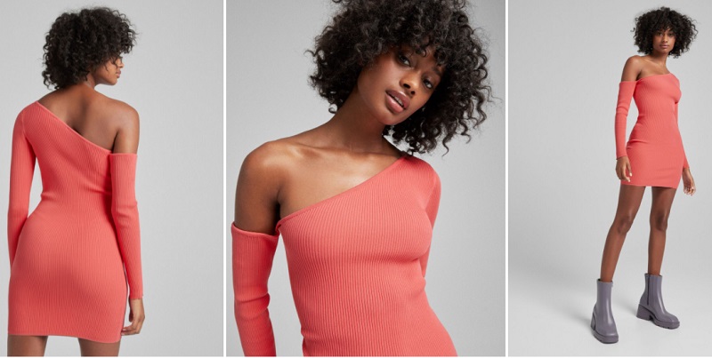 El tejido rib impregna todas las prendas de Bershka. Por ejemplo, es el protagonista de este vestido asimétrico. Recibe este calificativo porque va a dejarte un hombro al aire, aunque el brazo lo llevarás tapado. Este modelito está disponible en color salmón y en negro. Esta marca de Inditex lo tenía a la venta por 19'99 euros, pero ahora lo tiene rebajado un 40%. Puedes comprarlo por tan solo 11'99 euros.