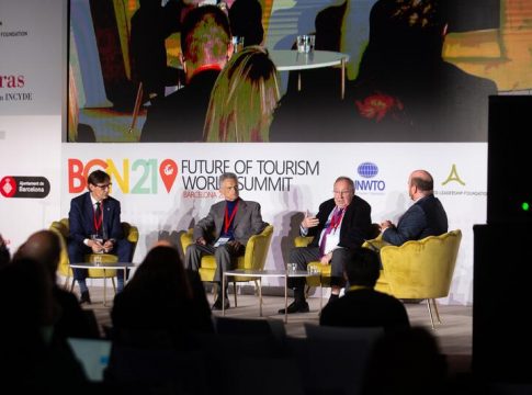 La ministra de Industria, Comercio y Turismo, Reyes Maroto, el secretario general de la Organización Mundial del Turismo de las Naciones Unidas (OMT), Zurab Pololikashvili, el presidente de la Fundación INCYDE de las Cámaras de Comercio Españolas, José Luis Bonet, el conseller de Empresa y Trabajo de la Generalitat, Roger Torrent, el primer teniente de alcalde del Ayuntamiento de Barcelona, Jaume Collboni, la diputada de Turismo de la Diputación de Barcelona, Abigail Garrido, y el presidente de la Fundación Advanced Leadership, Juan Verde, inauguraron ayer el congreso Future of Tourism World Summit. Bajo la Presidencia de Honor de S.M., el Rey Felipe VI, la cumbre de dos días en formato híbrido se celebra en La Casa Llotja de Mar de Barcelona.