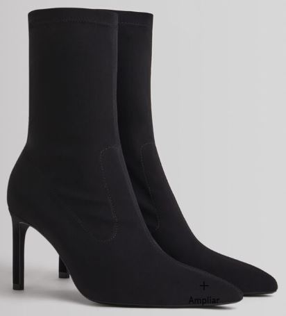 En Bershka, también hay disponibilidad en botines de tacón ajustados por un costo de 29.99 euros. Estamos en presencia de uno de los zapatos más vendidos de la marca. Muestra de ello, es que las tallas se están agitando muy rápido. En caso de que quieras llevarte de uno, deberías hacer tu pedido con prontitud. Encontrarás tallas 36, 37, 38, 39 y 40. El color negro nunca pasa de moda, y con la ropa que te pongas vas a lucir bien. El talón de este calzado es fino, con material elástico y punta fina. El forro es de 60% poliuretano y 40% poliéster.