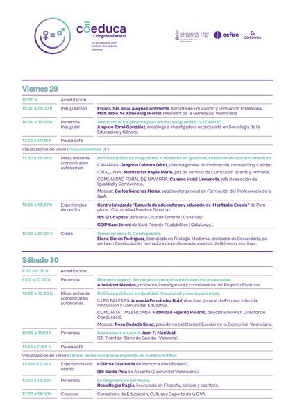 Habrá mesas redondas que abordarán las políticas públicas en igualdad que se impulsan desde las aulas en las autonomías, como el plan director de coeducación de la Generalitat, así como cinco experiencias de centro de éxito en coeducación, entre ellas la del IES Santa Pola (Alicante) como uno de los institutos que participan en el programa Coeducacentres para promover los valores de igualdad de género y mejorar la convivencia y la coeducación.