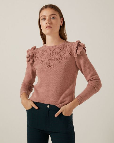 En Springfield tienes la posibilidad de adquirir una jersey nueva y a la moda. El color fresa que ha puesto a valer la compañía combina con un jean y dada su versatilidad podrías hacer las combinaciones que más te guste. Este artículo es de hombros volantes, manga larga y cuello redondo. En la zona de los hombros, posee detalles al igual que en la parte delantera en forma de calados. Por un costo de 29.99 euros, puede ser tu nueva adquisición para que amplías tus outfits diarios. Tanto para salir a hacer algún trámite como para ir al trabajo.