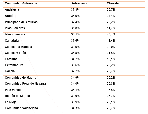 A nivel geográfico existen algunas comunidades con mayor tasa de incidencia. En Galicia y Andalucía la obesidad se sitúa en un 26,7%. De cerca le siguen el Principado de Asturias (26,2%) y la Región de Murcia (25,7%). En el extremo opuesto encontramos a las Islas Baleares (11,7%), Cataluña (16,1%) y País Vasco (16,5%).
