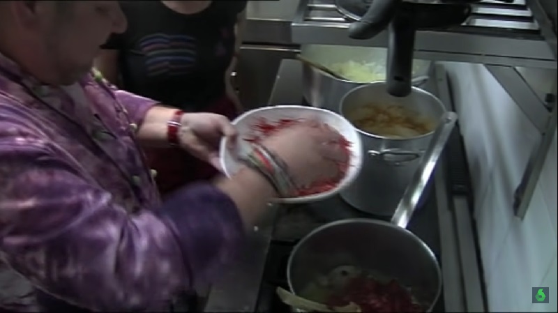 Aquí llega uno de los trucos imbatibles de Chicote. El cocinero añade las cabezas de los carabineros para que se marquen junto a la cebolla y el ajo. Eso sí, no tienes que removerlas para que no suelten agua y se disuelva su potente sabor. Tampoco las viertas sobre la cazuela, es mejor que las añadas con las manos. Retíralas después de un minuto y echa el tomate picado. Continuamos con la receta...