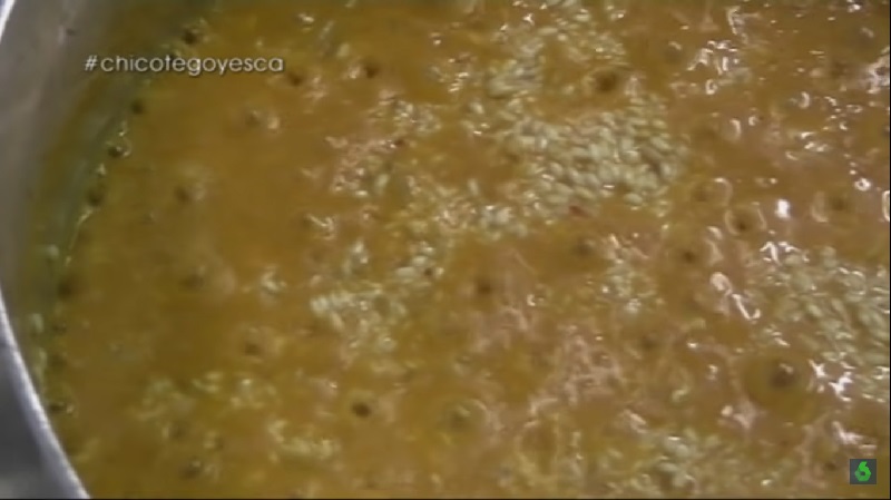 Chicote nos recomienda darle una primera cocción al arroz con agua. En apenas 10 minutos, el líquido se habrá evaporado, pero los granos no estarán en su punto todavía. Por lo que el cocinero le añade un cazo de caldo de pescado, que él mismo ha hecho con las cabezas de los carabineros. Llega el momento de añadir el marisco al guiso...