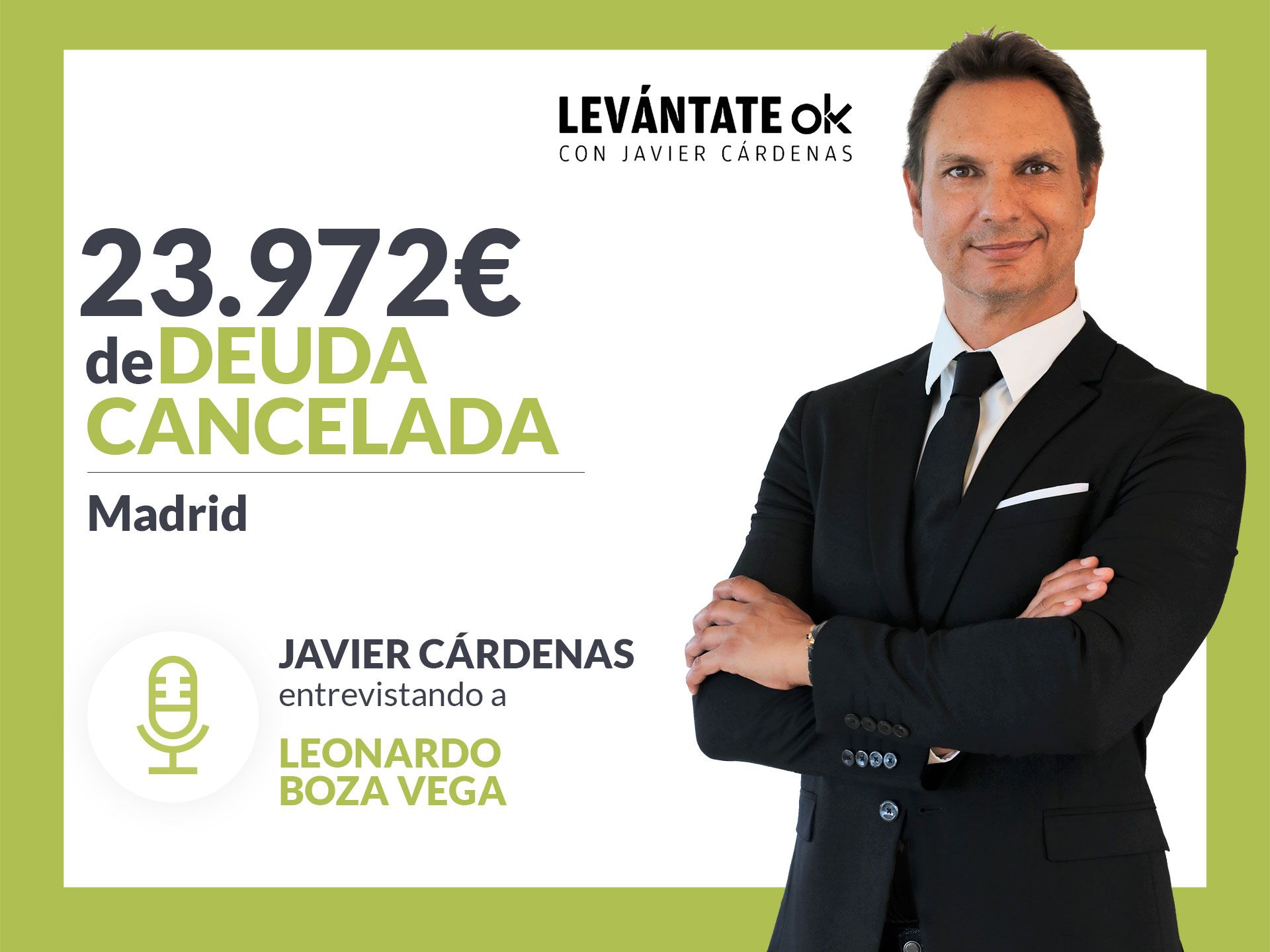 El famoso presentador de radio, Javier Cárdenas, ha realizado una entrevista a una de las personas que se ha acogido a la Ley de Segunda Oportunidad con Repara tu Deuda, despacho de abogados líder en España en su aplicación. Se trata de la tercera ocasión que lo realiza en su programa ‘Levántate OK’ que emite cada día en OKdiario y en el que conversa con personas que no tienen deudas gracias a la Ley de Segunda Oportunidad. En esta ocasión, ha hablado con Leonardo Boza, vecino de Madrid. ENTREVISTA COMPLETA.