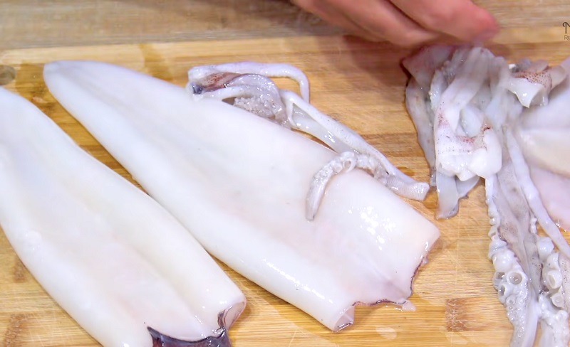 Aunque los calamares suelen venir limpios de la pescadería, no esta de más que los pases otra vez por el grifo. Si los has comprado congelados, también tienes que hacer este paso. Una vez que te hayas asegurado de que no tengan ninguna impureza, puedes cortarlos separando los tentáculos de su cuerpo.