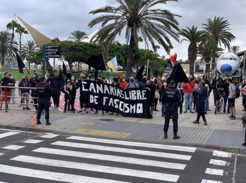 Bajo gritos como "la tumba del fascismo Canarias será" y con la pancarta 'Canarias libre de fascismo' estas personas han mostrado con banderas negras su desacuerdo con la asistencia del líder del partido.