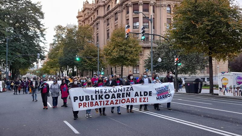La movilización, organizada por las entidades que integran la plataforma 'Euskal Eskola Publikoaz Harro', ha arranco pasadas las 17.00 horas desde las inmediaciones de la Delegación del Gobierno Vasco, para finalizar la Plaza de Arriaga, donde se ha leído un comunicado.