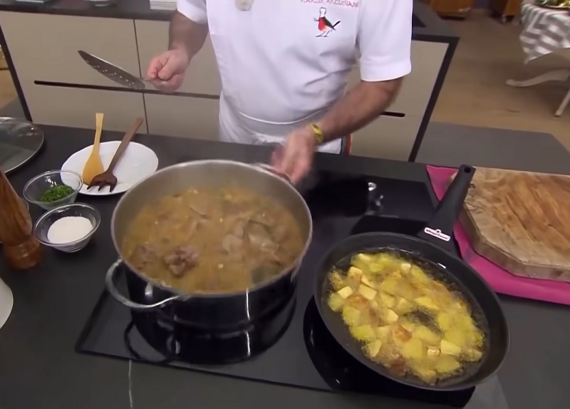En lo que el guiso se va haciendo, pela las patatas y pícalas en cuadrados. Pon una sartén el fuego con generoso aceite para freír los trozos de este tubérculo. Una vez que haya pasado la media hora de cocinado y las patatas se hayan dorado, deja que se haga los últimos cinco minutos junto a las patatas.