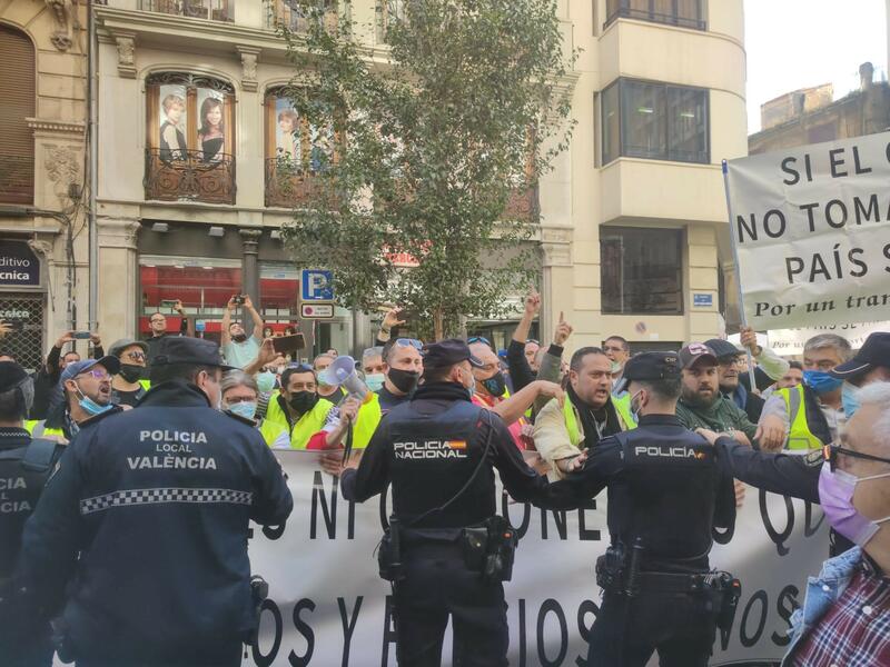 Una protesta de transportistas ha recibido entre gritos y ha tirado huevos a la vicepresidenta del Gobierno, Yolanda Díaz; la alcaldesa de Barcelona, Ada Colau; la vicepresidenta de la Generalitat Valenciana, Mónica Oltra, la portavoz de Más Madrid, Mónica García, y la portavoz del Movimiento por la Dignidad y la Ciudadanía en Ceuta, Fátima Hamed Hossain, a su llegada al acto #OtrasPolíticas que se ha celebrado este sábado en el Teatro Olympia de València.
