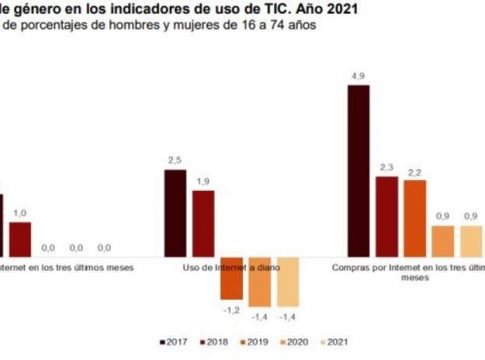 Por sexo, la brecha a favor de los hombres se mantiene a los niveles de 2020 tanto en el uso de Internet en los tres últimos meses (3,8 puntos) como en las compras por Internet. Y sólo baja en el uso diario de Internet (2,6 puntos frente a 2,7 del año anterior).