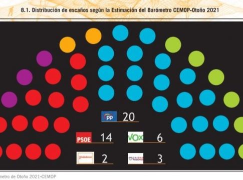 En concreto, según este barómetro, el PP conseguiría un 39,5% de los votos en unos hipotéticos comicios autonómicos celebrados hoy y obtendría 20 escaños, es decir, cuatro diputados más que en las pasadas elecciones. A continuación, el PSOE sería la segunda fuerza en el hemiciclo, con un 29,5% de los votos y 14 escaños, tres menos que los cosechados en las elecciones de mayo de 2019.
