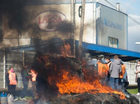 En la protesta se ha bloqueado la vía de entrada a la fábrica con una barricada en llamas de neumáticos, paja y cartones. Asimismo, han portado una pancarta de 'Polo noso traballo. Polos nosos produtos. Prezos xustos'.