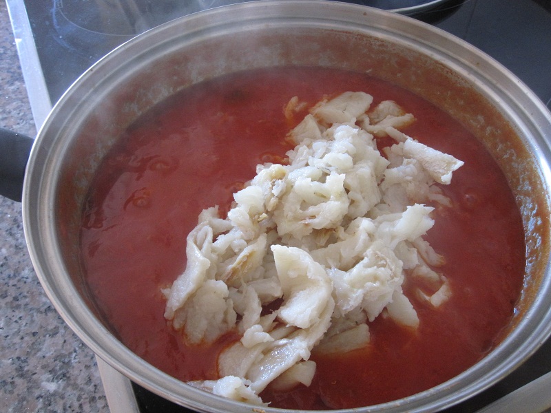 Así pues, retira la piel del pescado y las espinas. Luego, córtalo en tiras. Cuando la salsa de tomate esté lista y haya espesado, añade un poco de agua o caldo de pescado y remueve. Prueba de sal y rectifica si es necesario, pero ten en cuenta que el pescado ya aportará sal.