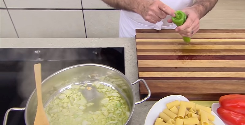 Una vez que tengas la cebolla cortada, júntala con el ajo en la cazuela y remuévela bien para que se mezclen. Después, tienes que quitarte el tallo y las pepitas a los pimientos. Arguiñano recomienda empujar el rabo de la verdura hacia dentro para que salga de una forma más sencilla. Corta tanto el rojo como el verde en cuadraditos y échalos al sofrito. Continuamos con la receta...