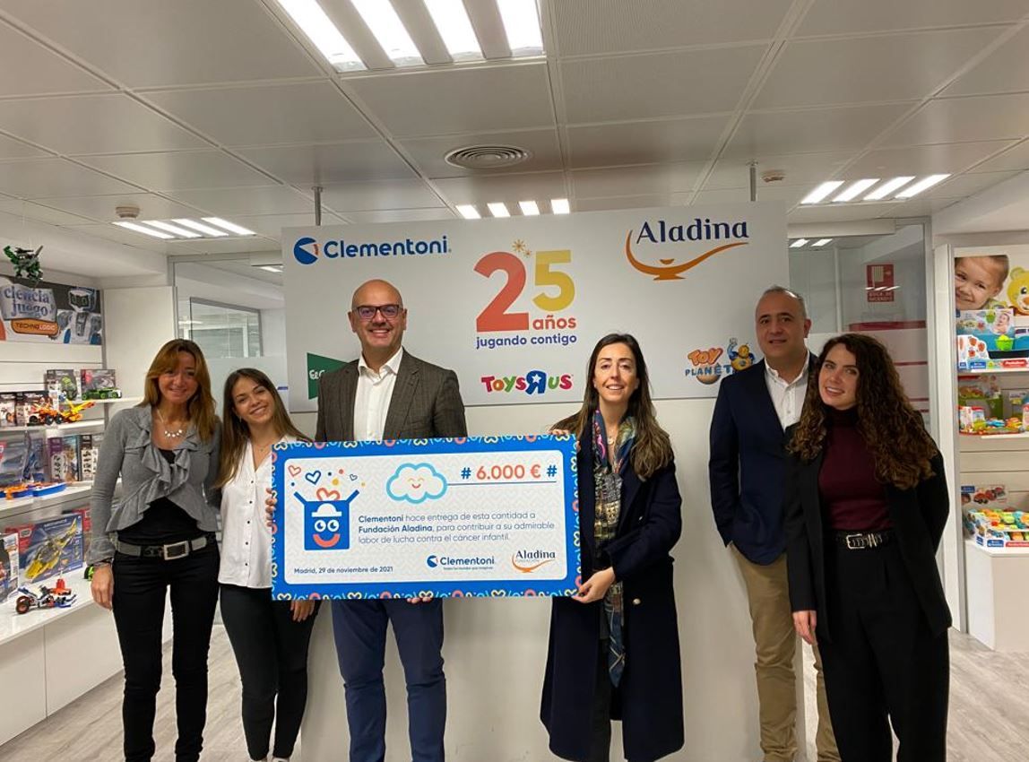 Clementoni, marca líder en juguetes educativos, ha entregado hoy un cheque por valor de 6.000€ a la Fundación Aladina, para brindarles apoyo en el desarrollo de su programa integral para niños y adolescentes enfermos de cáncer