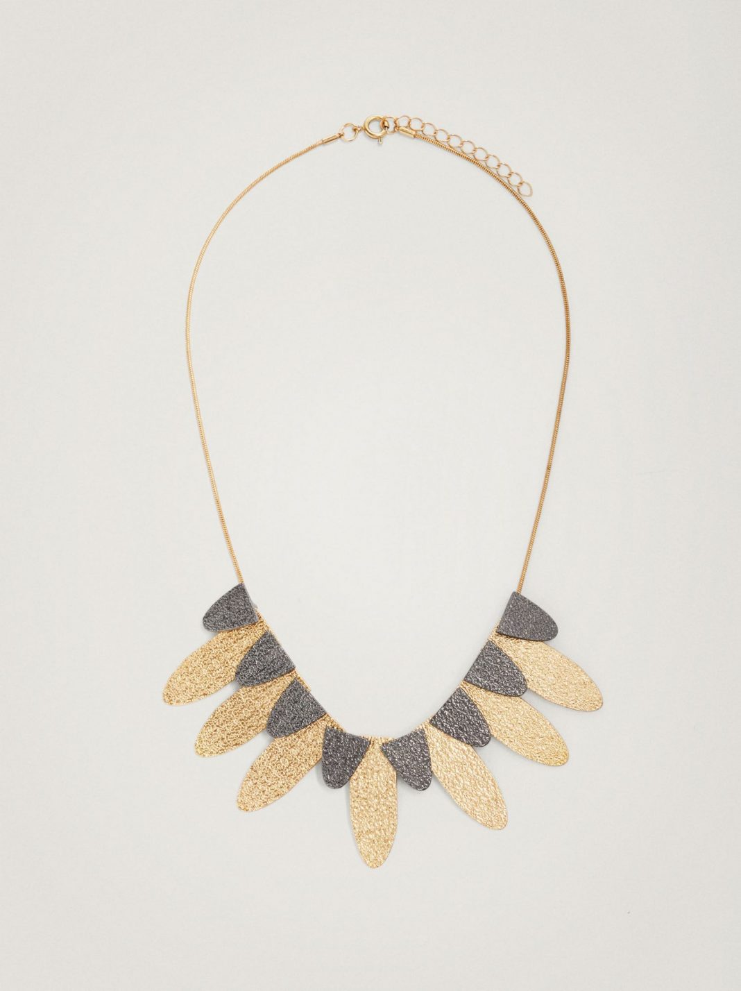 Los tonos dorados y oscuros como los que combina este collar corto de colgantes de Parfois combinan a la perfección con casi cualquier tipo de outfit. Se trata de un collar fabricado 100% en zinc. Su diseño, con los colgantes largos dorados y los cortos oscuros tiene un cierto toque étnico. Se trata de un collar que destacará sobre tu escote aportando un toque de brillo y de lujo a tu conjunto. Tiene un precio de sólo 12,99 euros.