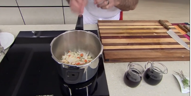 Pela una zanahoria y corta en cuadros pequeños; pela dos dientes de ajo y córtalos en trozos finos. Corta la cebolla en cubos y en la misma olla donde se sellaron las carrilleras agrega las verduras por unos 4 o 5 minutos hasta que estén pochadas.