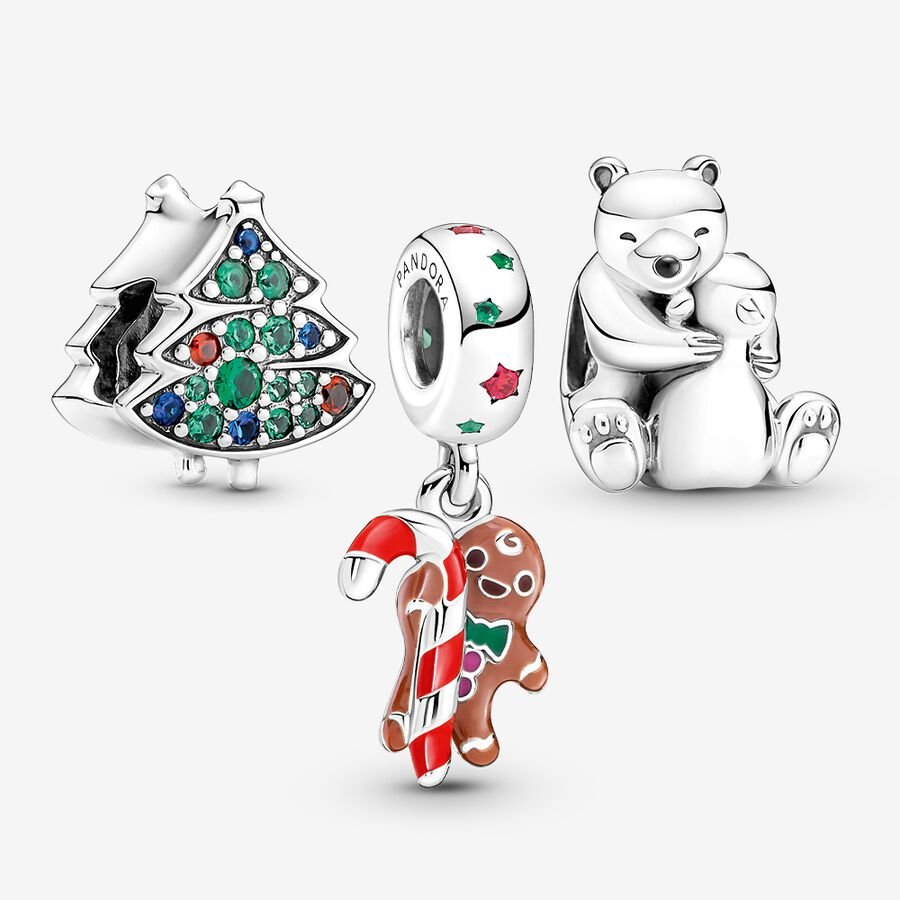 Imprégnate del espíritu navideño con este Conjunto de Regalo Navidad Familiar. Está compuesto por tres fantásticos accesorios. El Charm Árbol de Navidad, el Charm Colgante Hombre de Jengibre, y el Charm Osos Polares Abrazados.