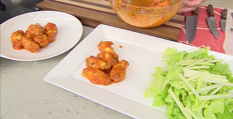 Para compensar la abundante carga calórica de las alitas de pollo con la salsa Buffalo, Arguiñano nos propone realizar una ensalada como guarnición de este plato. El cocinero vasco opta por una sencilla ensalada de lechuga con brotes de apio. Alíñala a tu gusto y degústala a la vez que tomes la carne. Pero veamos cuál es el resultado final de la receta...
