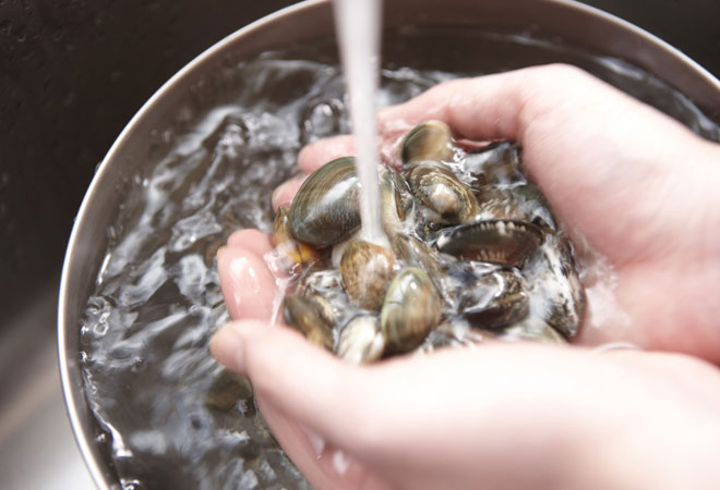 En lo que la salsa va reduciendo, lava las almejas concienzudamente. Pásalas por debajo del grifo para que suelten todos las impurezas que contengan. Aunque las hayas comprado congeladas, debes realizar este paso por si tienen algo de arenilla. No te olvides de retirar las que están rotas o en mal estado, ya que pueden echar por tierra la receta.