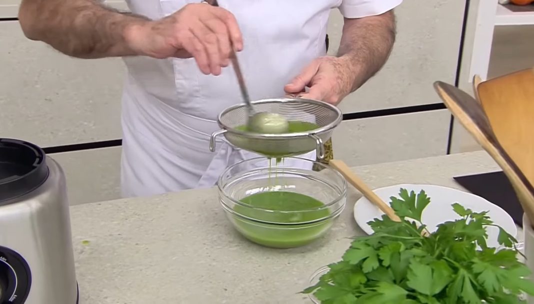 El líquido resultante tienes que pasarlo por un colador para evitar que queden grumos o impurezas en la salsa. Ahora llega el momento de hacer la mahonesa como tal. Por lo que tienes que romper un huevo y echarlo al vaso de la batidora con un poco de sal. Arguiñano le añade un chorrito de vinagre. Y como no, también le tienes que incorporar el aceite de perejil.