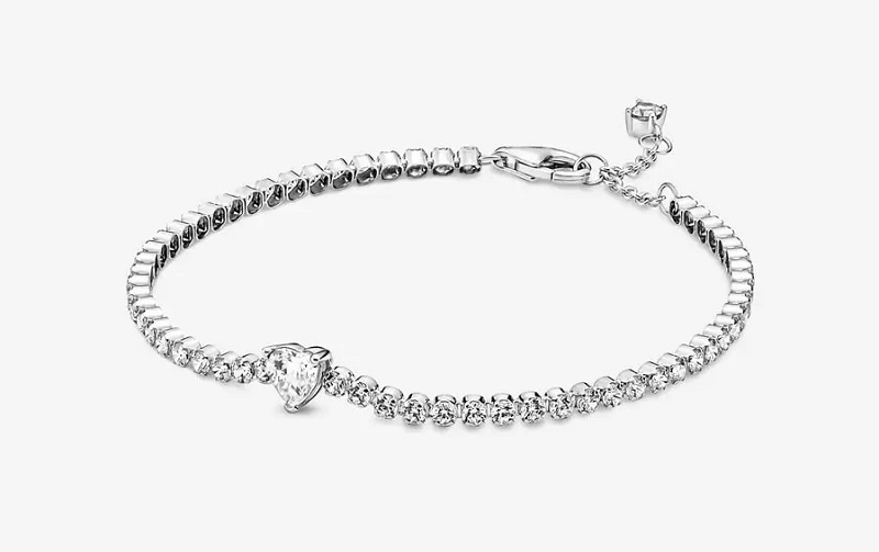 Ponle un toque de elegancia a todos tus looks con la pulsera Corazón Brillante. La joya está acabada a mano en plata de primera ley y decorada con brillantes circonitas cúbicas transparentes. Una gran gema central con forma de corazón remata una fila de pavé compuesta por gemas de tamaño uniforme. La pulsera incluye un cierre de mosquetón que cierra de forma segura y se puede ajustar a tres longitudes. Puedes comprar esta pieza de Pandora por 79 euros.