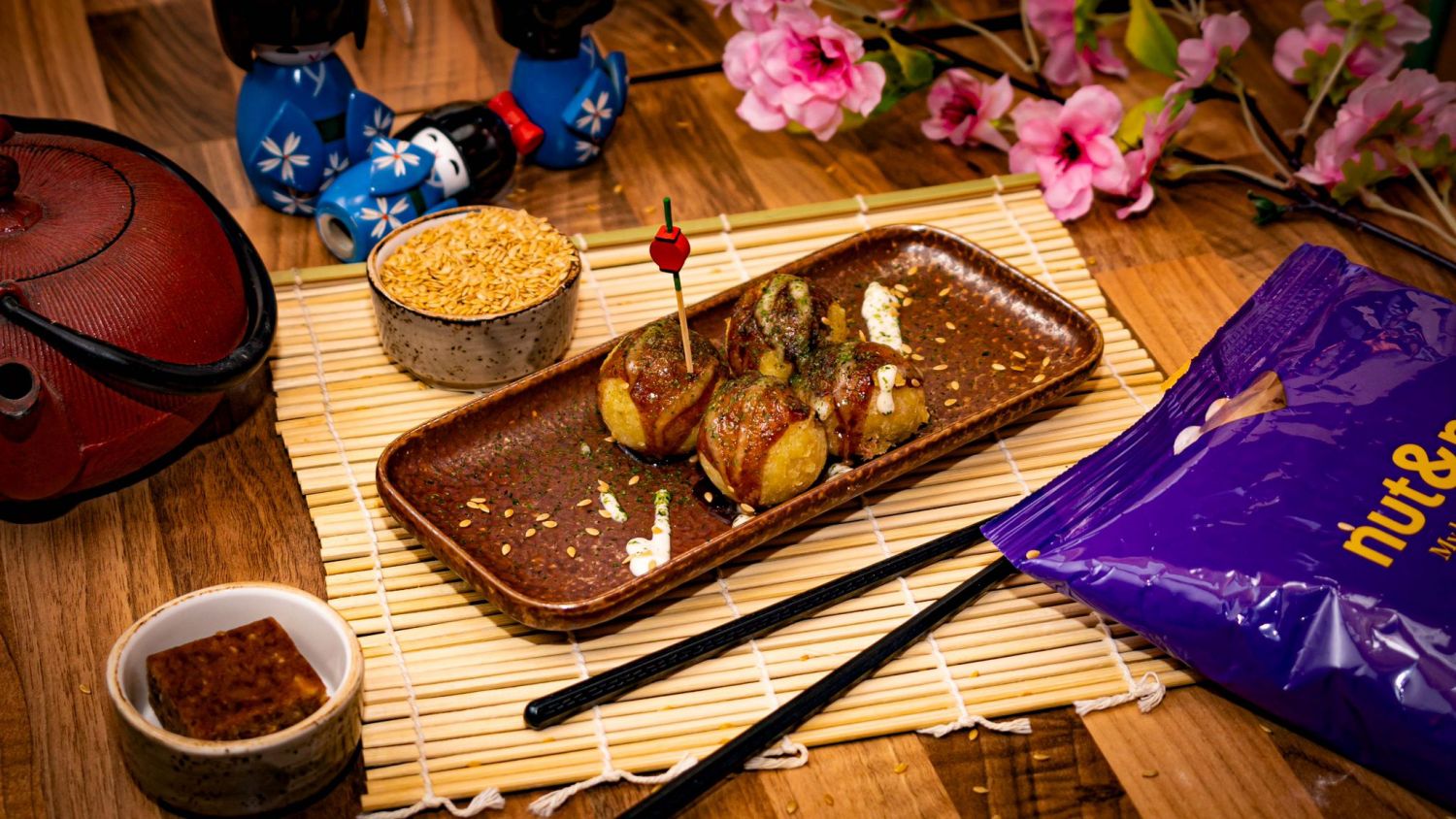 Por un precio cerrado de 22 euros, el menú incluye, para empezar, takoyaki vegano –el pulpo se sustituye por calamar vegano y el huevo por las semillas de lino de nut&me–, y cubiertos de una deliciosa salsa hecha con los dátiles de nut&me y de mayonesa vegana casera. Para continuar, se ofrece cerdo al jengibre con sésamo, ciruela y chips manzana, una pieza marinada en soja, sake, mirin, jengibre fresco y ciruelas pasas de nut&me, que se carameliza y se acompaña de pak choi y col china salteada y coronada con sésamo y manzana deshidratada de nut&me.