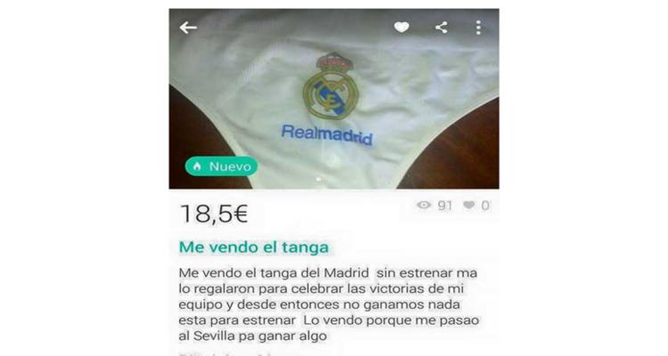 Así que infiel a su Real Madrid, te da la oportunidad de tener un tanga con el escudo. Se ha pasado al Sevilla para ver si gana algo, así que, si tienes un tanga con su escudo, a lo mejor podéis hacer un intercambio.