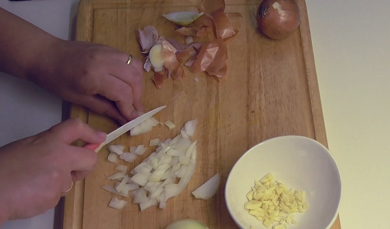 Cuando tengas los dientes de ajo bien picaditos le llega el turno a las cebollas. Utiliza dos si son pequeñas. En cambio, con una de gran tamaño es más que suficiente para realizar los garbanzos fritos. Pélala y córtala en cachos finos. Con esta verdura sucede lo mismo que con los ajos: cuánto más pequeños sean sus trozos, más difícil será que te los encuentres mientras comes.