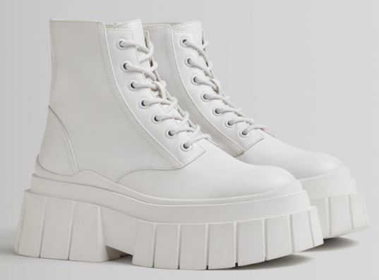 Estos botines de Bershka te van a encantar. Y es que, se trata de uno de los modelos más bonitos y a la moda que puedes ver en la tienda. Sin duda, te lo querrás llevar en tus compras. Es un botín acordonado con una plataforma rayada y viene en un color blanco que te hará ver guapísima. Pero la mejor parte es que está a mitad de precio. Te lo llevarás por un costo de 19.99 euros, desde la talla 35 a la 40. Te contamos que la suela es 100% caucho termoplástico, su forro es 85% poliéster y 15% poliuretano. Además, el corte del zapato es 100% poliuretano.