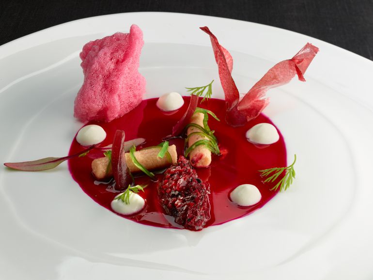 Martín Berasategui saca un arsenal de postres para poner el broche de oro a su menú degustación. El primero es un Gin Fizz frío-caliente de fresas Corazón Berry y lima, al que le sigue un limón con jugo de albahaca, judía verde y almendra. Después, nos sirve un toffee crujiente de avellanas, wasabi helado y escarcha de chocolate Pacari. Por último, el cocinero nos agasaja con sus golosinas: ougat de nueces y miel, gominola de frutos rojos, macarrón de mango y chocolate, esponjoso de coco, sopa fría de chocolate e infusión de fruta de la pasión y arándanos.