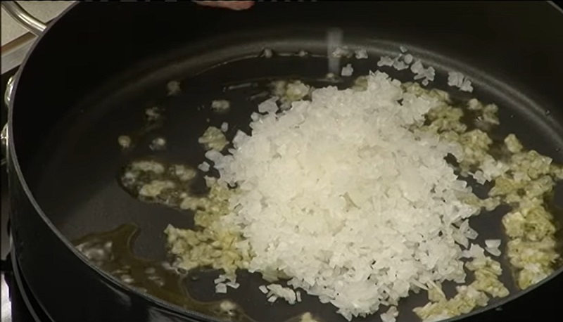 Vamos a empezar con la elaboración del relleno. Para ello, tienes que picar una cebolla en trozos muy finos. Pon una sartén en fuego y viértele un chorro generoso de aceite de oliva virgen extra. Cuando esté caliente, añádele los trozos de la cebolla. Incorpórale un poco de sal y deja que se poche a fuego medio. Ahora llega el momento de preparar los chipirones...
