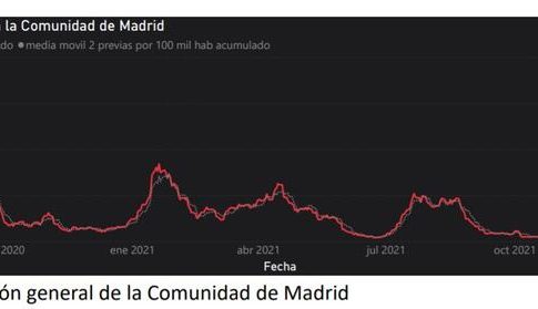 El sistema Vigía publica cuatro gráficos. Los tres primeros muestran la evolución general para toda la Comunidad de Madrid, Madrid capital y resto de la región y el cuarto expone la evolución del estado general de los puntos de muestreo por colores.