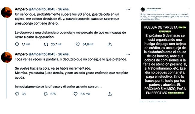Y a las peticiones de las organizaciones que defienden los derechos de los consumidores, se unen miles de ciudadanos que emprenden su propia campaña mostrando su enfado. Ayer mismo, una usuaria de Twitter estremecía a sus seguidores mientras relataba en hilo la experiencia vivida en la cola del cajero, presenciando las dificultades de un hombre de 80 años cuando intentaba, sin éxito, realizar un ingreso en efectivo.